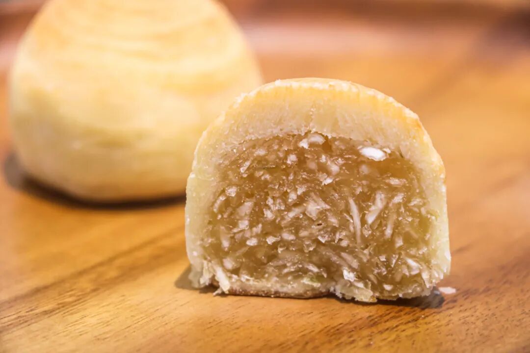 清香的酥皮包裹着热带风味十足的椰蓉,一口咬下去看得见的椰肉,丝丝清甜在舌尖,低糖不油腻,配合口感极佳,配合一杯清茶便是这个中秋经典而美好的味道了。
